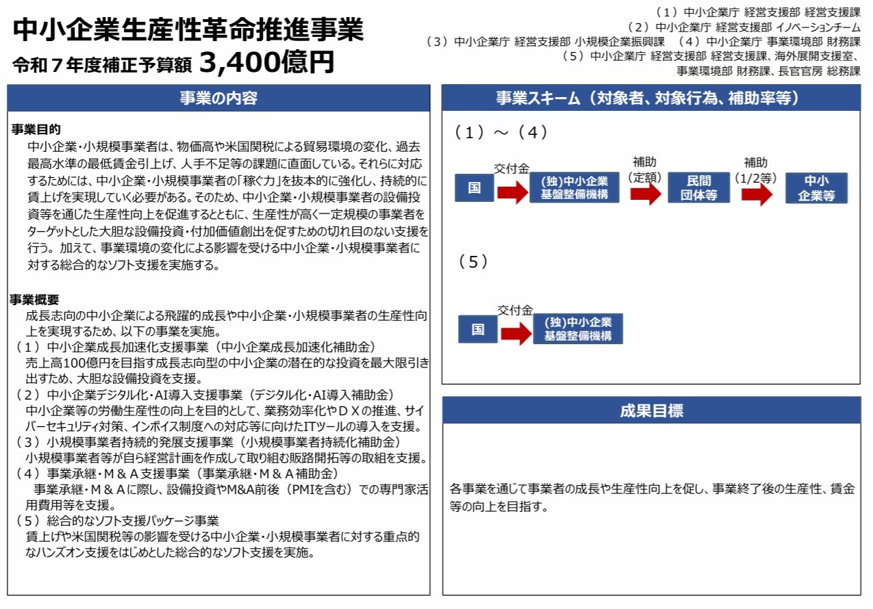小規模事業者持続化補助金は、国が推進する中小企業生産性革命推進事業の一環として実施されている補助金です。2025年12月、経済産業省より以下のような翌年度の予算案が公表されました。